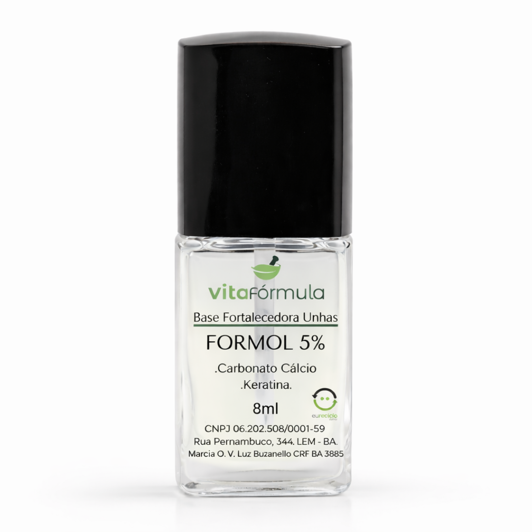 Fórmula manipulada com Formol 5% - quantidade segura e autorizada pela Agência Nacional de Vigilância Sanitária (ANVISA), a qual permite o uso de formaldeído em concentrações de até 5% em bases para fortalecimento de unhas.